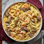 Reheat leftovers on low heat on the stovetop, adding a splash of cream or pasta water to bring back the sauce’s creamy texture. Stir consistently to avoid curdling. The steak and shrimp are best added last and warmed through briefly to preserve their tenderness.