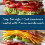 A hearty and delicious Breakfast Club Sandwich featuring crispy bacon, creamy avocado, fresh tomato, melted cheddar cheese, and perfectly cooked eggs layered between toasted whole grain bread slices. Perfect for a satisfying and flavorful morning meal.