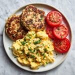 - Assemble the feast: Plate the scrambled eggs alongside the sausage patties, warm biscuits, and fresh tomato slices. Serve with butter, jam, or hot sauce on the side to complete the meal.