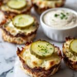 These Cheesy Pickle Chips are a quick and tasty snack featuring dill pickle slices topped with melted cheddar cheese and a savory dry ranch seasoning. Baked to crispy perfection in a mini muffin pan, they offer a delightful combination of tangy, cheesy, and seasoned flavors that make for an irresistible appetizer or party treat.