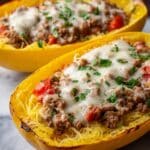This Cheesy Sausage-Stuffed Spaghetti Squash is a delicious and hearty low-carb meal featuring roasted spaghetti squash filled with a savory Italian sausage mixture, ricotta, and mozzarella cheeses. It’s baked until bubbly and golden, making it a perfect comforting dinner that’s both satisfying and nutritious.