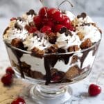 This Cherry Chocolate Chip Trifle is a decadent, layered dessert featuring moist chocolate cake, sweet cherry pie filling with a hint of almond, fluffy homemade whipped cream, and rich chocolate chips. Perfect for special occasions or a delightful treat, this no-bake assembly requires minimal effort and offers a visually stunning presentation.