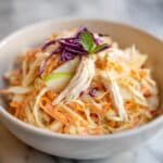 Pour the dressing over your slaw and chicken mixture, then toss everything gently but thoroughly to ensure each bite is coated with that luscious dressing. Refrigerate the salad for 15 to 30 minutes before serving. This chilling time allows the flavors to meld together beautifully, giving you a refreshing, cohesive salad that’s bursting with flavor.