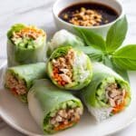 These fresh and flavorful Chicken Spring Rolls are light, healthy, and easy to prepare. Packed with tender shredded chicken, crisp vegetables, fresh basil, and rice noodles, wrapped in delicate spring roll skins and served with a tangy sweet chili dipping sauce, they make a perfect appetizer or light meal.