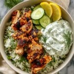 Elevate your Chicken Tzatziki Bowls: Mediterranean Bliss Recipe with a sprinkle of fresh herbs like finely chopped dill, parsley, or mint to enhance the Mediterranean vibe. A wedge of lemon on the side for an extra citrus burst is also a lovely touch that brightens the whole recipe.