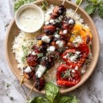 Start by spooning warm, fluffy rice into your bowl. Next, layer on the marinated, grilled peppers and the smoky chicken skewers. Generously drizzle or dollop with the creamy tzatziki and feta sauce. Add a few peperoncini slices for a little bright, vinegary kick if you like. Each bowl is a colorful, vibrant meal that’s sure to satisfy the senses.