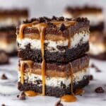 Indulge in these decadent Chocolate Chip Cookie Oreo Cheesecake Bars that combine a rich chocolate chip cookie crust, a hidden layer of whole Oreos, and a creamy Oreo-studded cheesecake topping. Perfectly baked and chilled to set, these bars offer a delightful blend of textures and flavors, finished optionally with a drizzle of caramel sauce for an extra touch of sweetness.