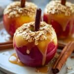 Delight in the comforting flavors of Cinnamon Oatmeal Stuffed Apples paired with a rich Homemade Vanilla Custard Sauce. This warm, baked dessert features tender apples filled with a cinnamon-spiced oatmeal mix, nuts, and dried fruit, served with a smooth, creamy custard that adds a perfect vanilla sweetness.