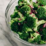 At least 30 minutes is ideal to let the flavors meld and the dressing soften the broccoli just slightly. If you refrigerate it longer, just remember to stir gently before serving.