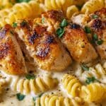 A rich and flavorful Creamy Garlic Butter Chicken & Rotini recipe featuring tender pan-seared chicken breasts tossed with rotini pasta in a luscious Parmesan cream sauce, infused with garlic and herbs. Perfect for a comforting and elegant weeknight dinner.