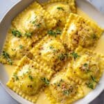 When reheating leftovers, warm gently over low heat on the stovetop. Add a splash of chicken broth or cream to restore the sauce’s silky consistency if it seems too thick. Stir frequently to prevent scorching, and reheat just until hot to keep the ravioli tender and the sauce smooth.