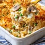 A creamy and comforting tuna casserole featuring tender egg noodles, succulent tuna, sweet peas, and a cheesy mushroom soup base, all topped with a crunchy cheesy panko breadcrumb crust and baked to golden perfection.