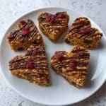 These Crunchy Granola Heart Bars are a delicious and wholesome snack made from rolled oats, almonds, honey, and coconut oil, baked to golden perfection and finished with a drizzle of dark chocolate and dried cranberries. Perfect for a healthy treat or breakfast on the go, these bars combine natural sweetness and nutty crunch with a festive twist of heart shapes.