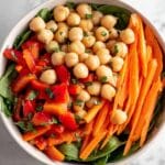 - Combine Ingredients: In a large bowl, mix the chickpeas, shredded carrots, diced bell pepper, sliced cabbage, and green onions thoroughly.