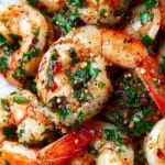 Reheat gently in a skillet over low heat, adding a splash of olive oil if the pan seems dry. Avoid using a microwave, as it can overcook the shrimp and diminish the garlic’s aroma and texture.