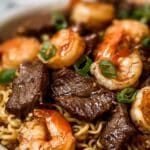 This Garlic Butter Steak and Shrimp Stir-Fried Noodles recipe combines tender slices of sirloin or ribeye steak and succulent shrimp cooked in a flavorful garlic butter sauce. Tossed with perfectly cooked egg noodles, soy sauce, oyster sauce, and sesame oil, this quick and delicious stir-fry is garnished with fresh green onions and a touch of red pepper flakes for optional heat. Ready in just 25 minutes, it’s a perfect weeknight dinner that’s packed with savory flavors and protein.
