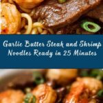 This Garlic Butter Steak and Shrimp Stir-Fried Noodles recipe combines tender slices of sirloin or ribeye steak and succulent shrimp cooked in a flavorful garlic butter sauce. Tossed with perfectly cooked egg noodles, soy sauce, oyster sauce, and sesame oil, this quick and delicious stir-fry is garnished with fresh green onions and a touch of red pepper flakes for optional heat. Ready in just 25 minutes, it’s a perfect weeknight dinner that’s packed with savory flavors and protein.