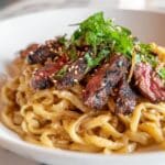 A quick and flavorful garlic butter steak lightning noodles recipe featuring tender flank steak, perfectly cooked egg or ramen noodles, and a savory garlic butter sauce infused with soy, oyster, and Worcestershire sauces. This dish is ideal for a satisfying dinner in just 25 minutes.