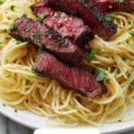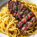 - Garnish and serve: Plate the garlic butter steak noodles while hot and garnish generously with freshly chopped parsley for a burst of color and freshness. Serve immediately for best taste.