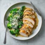 - Serve: Slice the chicken diagonally and arrange on the plate with the broccoli. Spoon the pan sauce over the chicken and broccoli, then grate or shave Parmesan cheese generously on top before serving.