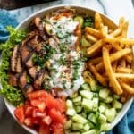 5. Add Tzatziki and Garnish: Drizzle each bowl generously with the chilled tzatziki sauce. Garnish with fresh dill or parsley to add brightness and a touch of color.