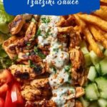 Divide the cooked rice or quinoa among four bowls. Next, layer on the sliced chicken, then scatter cherry tomatoes, diced cucumbers, red onion slices, kalamata olives, and crumbled feta cheese evenly. Finally, generous drizzles of the chilled tzatziki sauce bring everything together in one lively, creamy finish. Garnish with fresh dill or parsley for that extra burst of freshness.