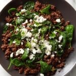 A quick and flavorful Ground Beef and Spinach Skillet with feta cheese, perfect for a nutritious weeknight dinner. This recipe combines tender ground beef with fresh spinach and aromatic spices, all topped with creamy feta and fresh parsley.