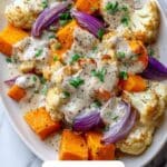 2. Prepare Vegetables: Chop the cauliflower into florets, cube or halve the sweet potatoes, slice the red onion into thick strips, and peel and chop the carrots into 1-inch pieces. Place all the vegetables into a large sheet pan.