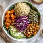 This Healthy Buddha Bowl is a vibrant and nourishing meal featuring roasted sweet potatoes, protein-rich quinoa and chickpeas, fresh vegetables, and a creamy tahini dressing. Perfect for a balanced lunch or dinner, it combines textures and flavors to create a satisfying, wholesome dish packed with nutrients and plant-based goodness.