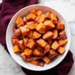 If you want to freeze, roast the sweet potatoes first and let them cool completely. Transfer to a freezer-safe container or bag and freeze for up to three months. Thaw overnight in the fridge before reheating for best texture and taste.