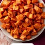 Delicious honey cinnamon roasted sweet potatoes make a perfect healthy side dish. Cubed sweet potatoes are tossed with olive oil, honey, cinnamon, salt, and pepper, then roasted until tender and caramelized. Garnished with fresh parsley, these sweet potatoes offer a warm, comforting flavor ideal for holiday meals or everyday dinners.
