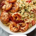 - Serve and Garnish: Plate the orzo and shrimp, then garnish with freshly grated Parmesan cheese and chopped fresh basil or parsley if desired.