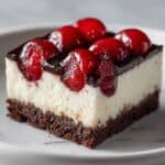 These Irresistible Cherry Chocolate Brownie Cheesecake Bars combine rich, fudgy brownie layers with a smooth, creamy cheesecake middle and a burst of cherry sweetness. Topped with melty chocolate chips and a beautiful cherry swirl, this layered dessert is perfect for any occasion and sure to satisfy your chocolate and fruit cravings.