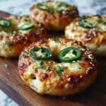 These Jalapeño Popper Bagels combine spicy jalapeños with creamy cheese and crispy bacon on toasted bagels, baked to golden perfection. A perfect savory snack or breakfast treat packed with bold flavors and gooey texture.