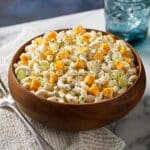This macaroni salad is best served cold or at room temperature, so reheating is not necessary. If you’d like to take the chill off, simply let it sit out of the fridge for 15-20 minutes before eating.
