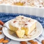 - Poke and Pour Glaze: Using the handle of a spoon, spatula, or a chopstick, poke holes evenly across the warm cake about every 1/2 inch. Slowly pour the almond glaze over the cake, ensuring it seeps into the holes for maximum flavor absorption. Allow cake to cool completely.