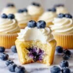 - Frost Cupcakes: Once cupcakes are fully cooled, pipe the lemon cream cheese frosting onto each cupcake. Garnish each with three fresh blueberries on top.