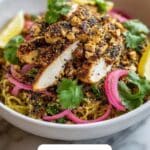 Divide the luscious noodles and broth evenly among your bowls. Slice the rested chicken breasts and place them on top. Now comes the fun part — garnishing! Sprinkle thinly sliced red shallots, black sesame seeds, crushed nuts, fresh herbs, and add a lemon wedge on the side for that extra zing. The combination makes your Lemon Garlic Chicken Noodle Bowl Recipe visually stunning and packed with layers of texture and flavor.