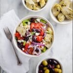 This Mediterranean Artichoke Salad Recipe includes feta cheese, which is not vegan. However, you can substitute it with a vegan feta alternative or omit it entirely to make the salad vegan-friendly without losing much of its character.