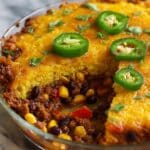 A hearty Mexican Cornbread Casserole combining seasoned ground beef, diced tomatoes with green chilies, and corn, topped with a creamy cornbread mixture and cheddar cheese. This comforting casserole bakes until golden and bubbly, perfect for family dinners or potlucks.