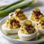 Million Dollar Deviled Eggs are a rich and flavorful twist on the classic deviled eggs recipe, featuring a creamy filling made with mayonnaise, melted butter, mustards, and a hint of pickle juice and hot sauce. Topped with crumbled bacon, paprika, green onions, and sliced pickles, these deviled eggs are perfect for parties, gatherings, or as an elegant appetizer.