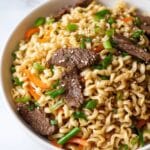 - Combine beef, noodles, and sauce: Return the seared beef to the pan along with the drained ramen noodles. Toss everything together using tongs or a spatula until the beef and noodles are evenly coated with the savory sauce.