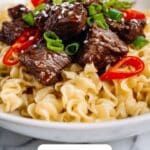 - Serve immediately for the best texture of noodles and crispy beef.