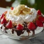 Cover the dish and refrigerate your No-Bake Banana Split Dessert Recipe for at least 4 hours. This resting time allows all the layers to meld together perfectly, improves texture, and ensures serving a refreshingly cool treat that’s full of flavor and fun.