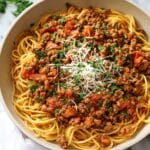 This One-Pot Taco Spaghetti combines the bold flavors of taco seasoning with tender spaghetti pasta for a quick and easy dinner. Ground beef is simmered with diced tomatoes, tomato sauce, and cheese all in one skillet, making it a convenient, family-friendly meal packed with savory and cheesy goodness.