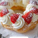 This classic French Paris-Brest pastry features delicate choux pastry rings filled with luscious whipped cream and fresh strawberries. Topped with toasted almonds and a dusting of powdered sugar, it’s an elegant dessert perfect for impressing guests or treating yourself.