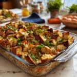 This stuffing pairs wonderfully with roasted turkey or chicken, helping soak up gravies and sauces with ease. It also complements hearty sides like green bean casserole, cranberry sauce, and mashed potatoes, creating a full and comforting plate. If you prefer a vegetarian spread, pair it with roasted vegetables and a crisp, bright salad for balance.