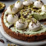 A luscious Pistachio Cream Skillet Cookie featuring layers of buttery cookie dough, melted pistachio cream, chopped pistachios, and chocolate chunks baked to gooey perfection in a cast iron skillet. This dessert delivers a perfect balance of nutty richness and sweet, soft texture, ideal for sharing with friends and family.
