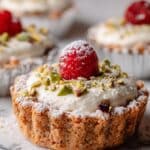 Delight in these elegant Pistachio Raspberry Tartlets featuring a buttery, crumbly crust filled with a sweet pistachio egg custard and topped with fresh raspberries. Perfectly baked to a golden finish and dusted with powdered sugar, these tartlets are a stunning dessert for any occasion.
