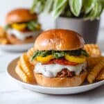 This Pizza Burger recipe combines the best of two classic favorites—juicy burger patties blended with Italian sausage, topped with melted mozzarella, pepperoni slices, and fresh basil, all nestled in a warm hamburger bun with zesty pizza sauce and tangy pickled banana peppers. Perfect for a fun and flavorful 30-minute meal that impresses both burger and pizza lovers alike.